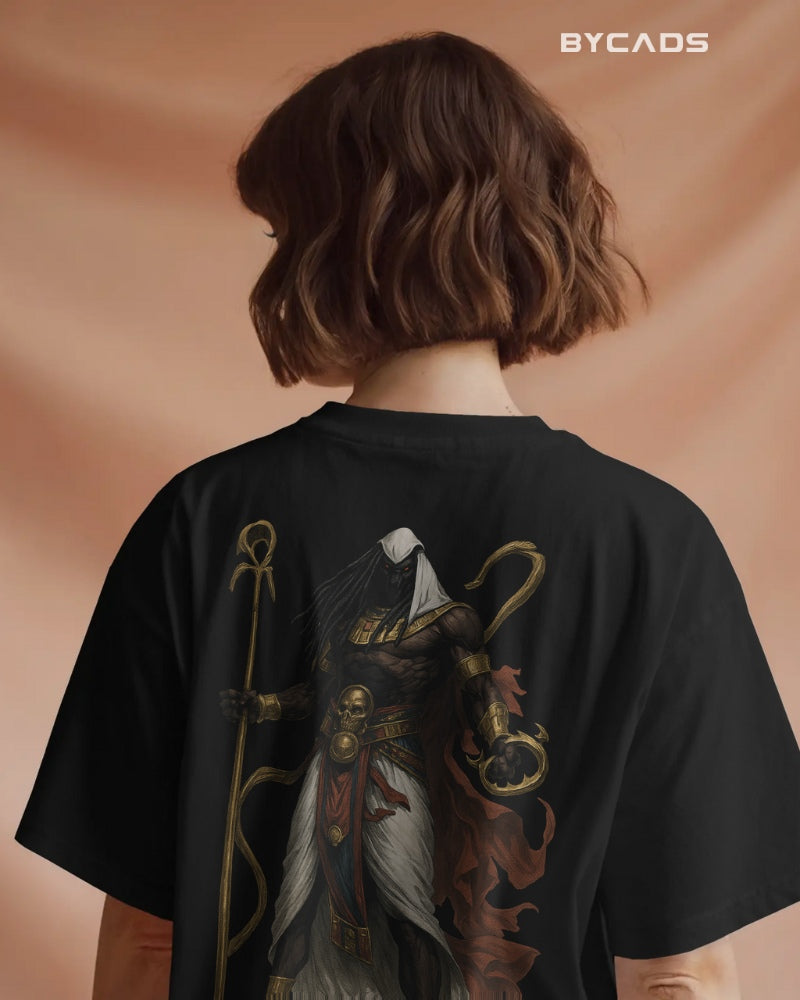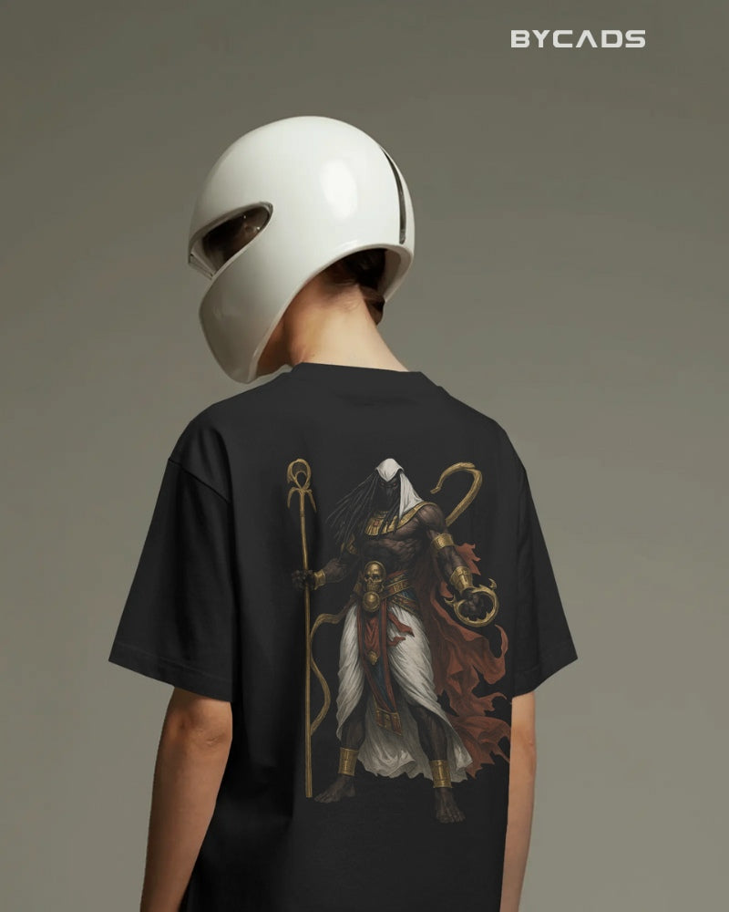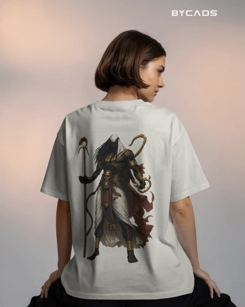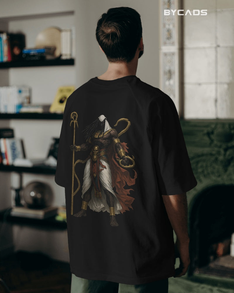 Summon the raw energy of the afterlife with the Anubis God of Death Oversized T-Shirt from Bycads. Featuring a bold and imposing depiction of the ancient Egyptian deity Anubis — the protector of the dead and the master of souls — this design is a powerful fusion of mythology and street culture. His muscular stance, adorned in regal armor with traditional Egyptian symbols like the ankh and crook, commands attention and respect.