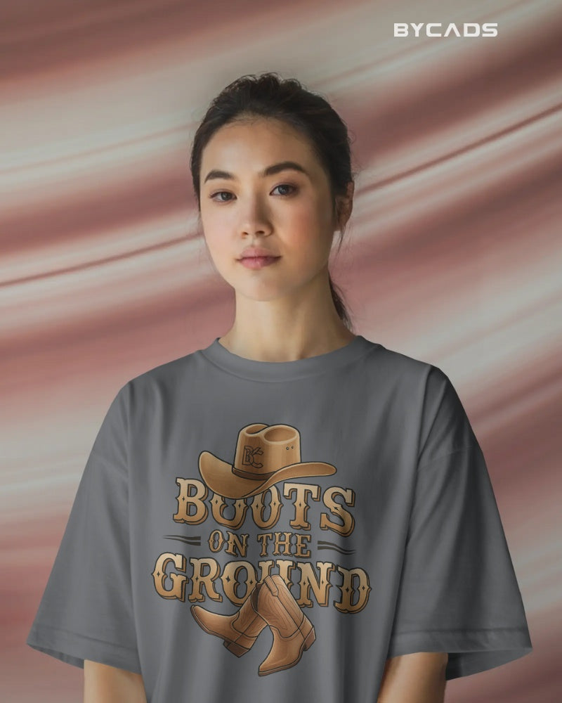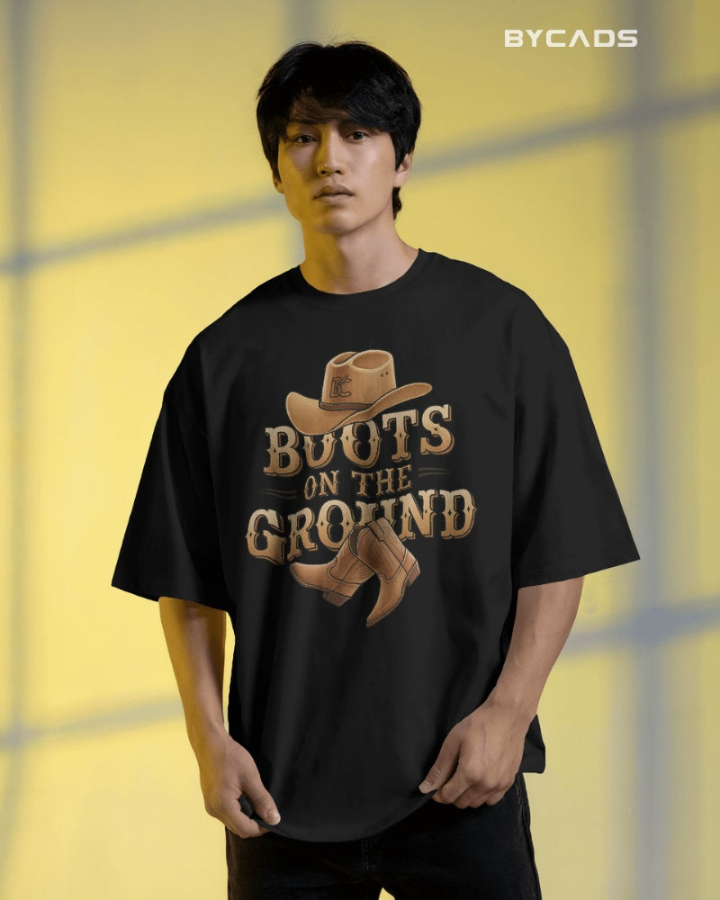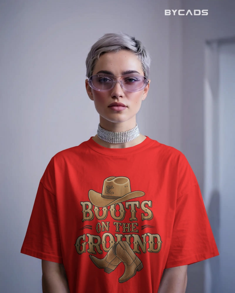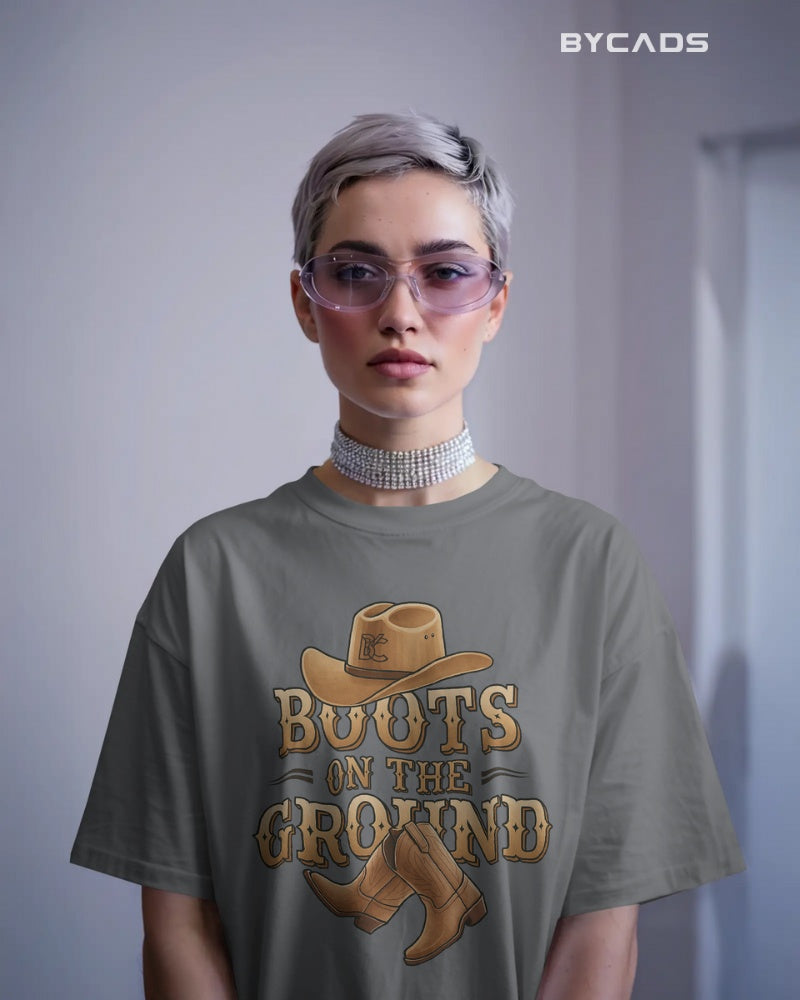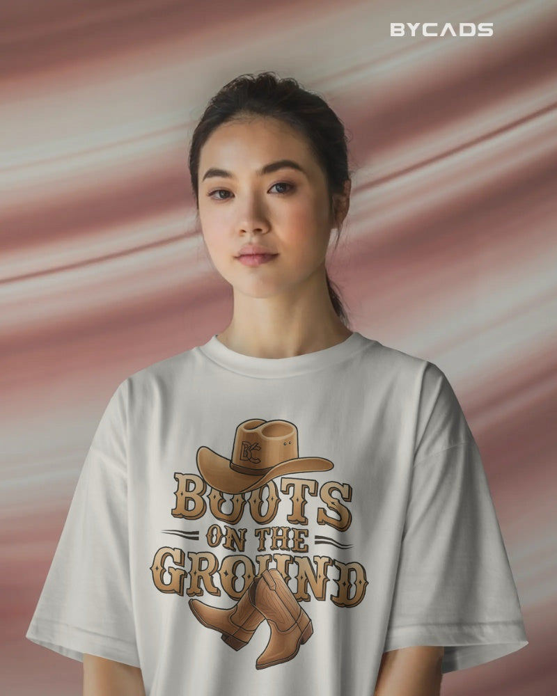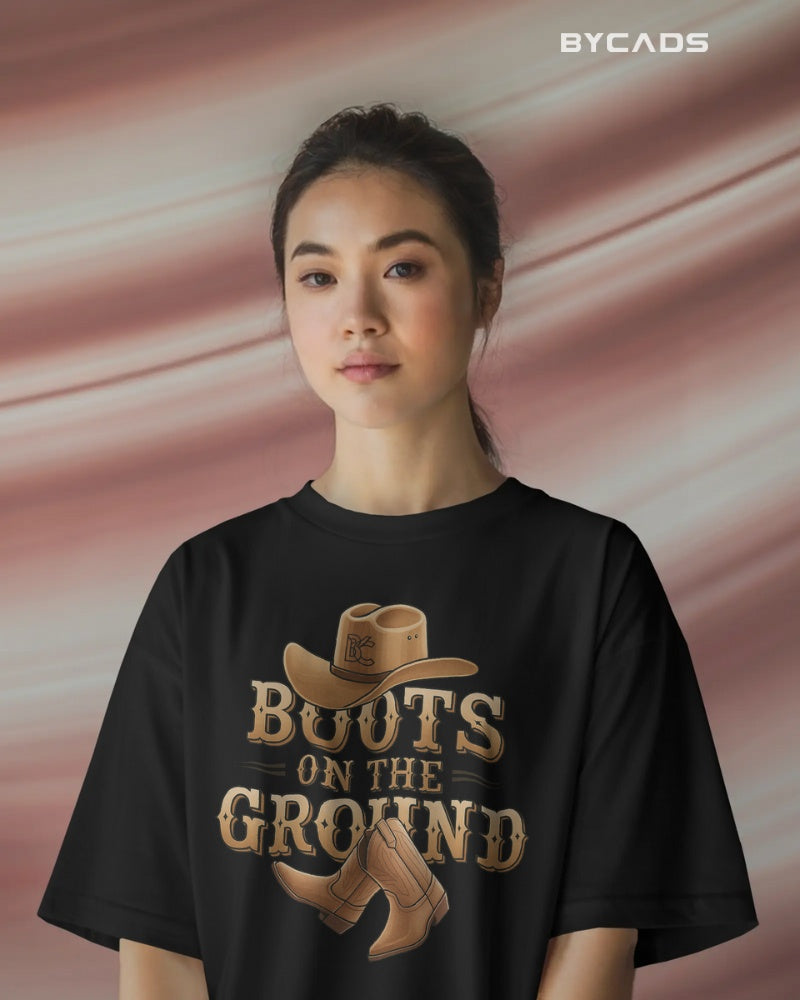 Step out with a rugged Western vibe in Bycads’ Boots On The Ground Oversized T-Shirt. This bold graphic tee features classic cowboy boots and hat artwork paired with a statement that’s all about grit, adventure, and living life at full stride. Designed for a relaxed oversized fit, this tee is ideal for rodeo fans, country lovers, or anyone who wants to add a dash of cowboy attitude to their everyday streetwear.