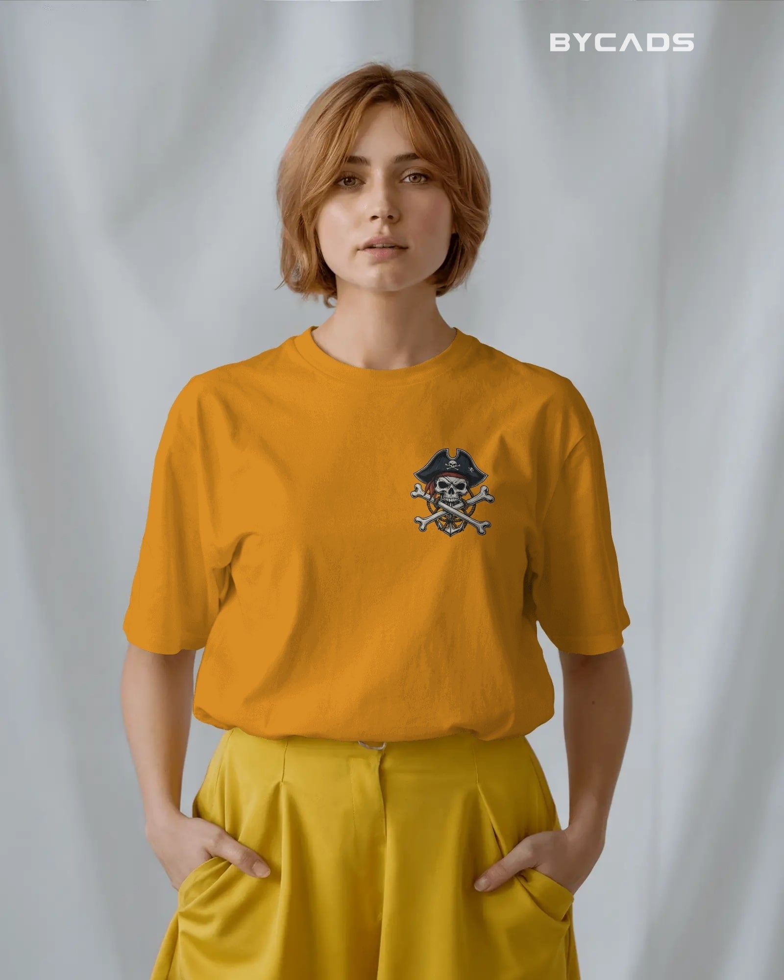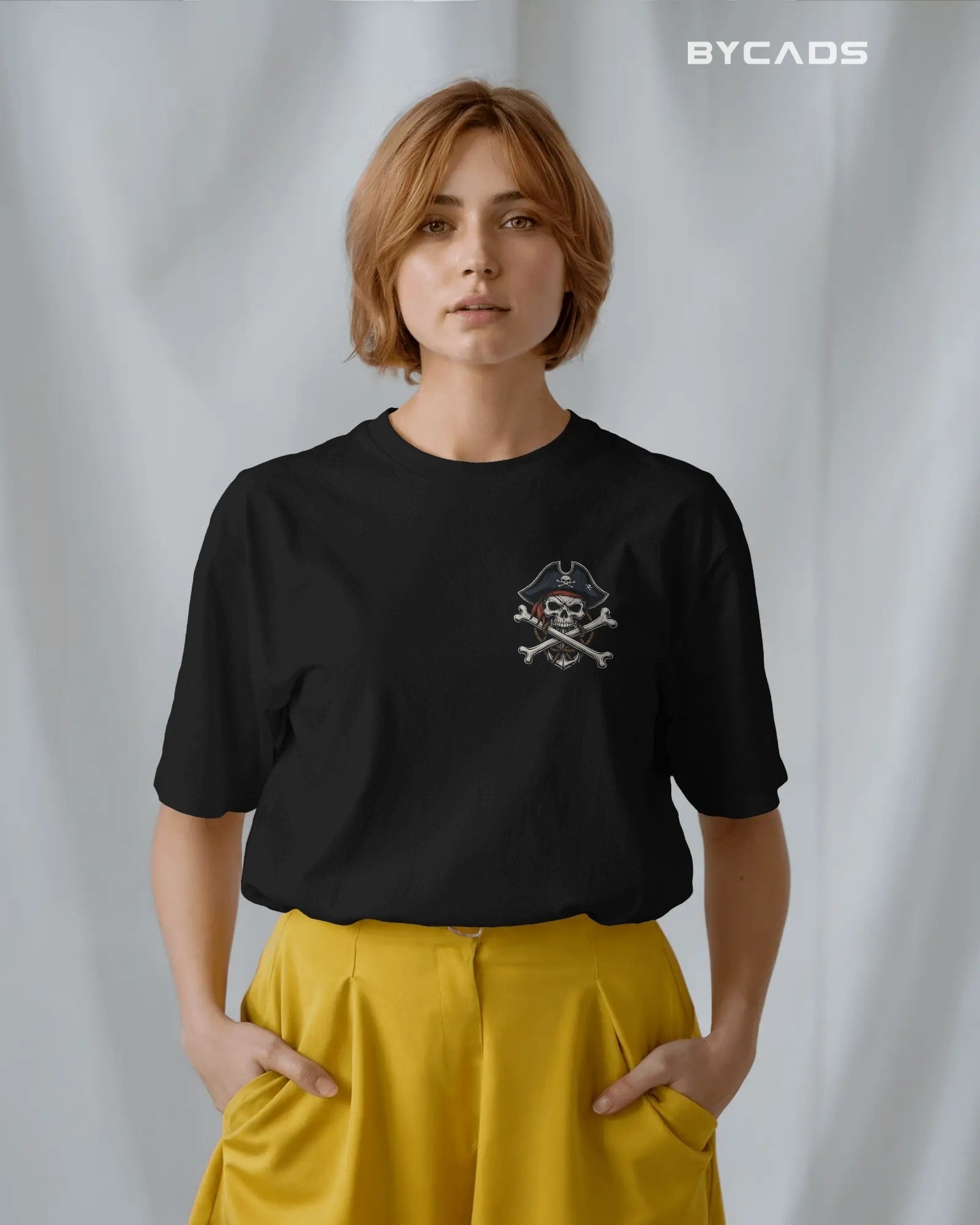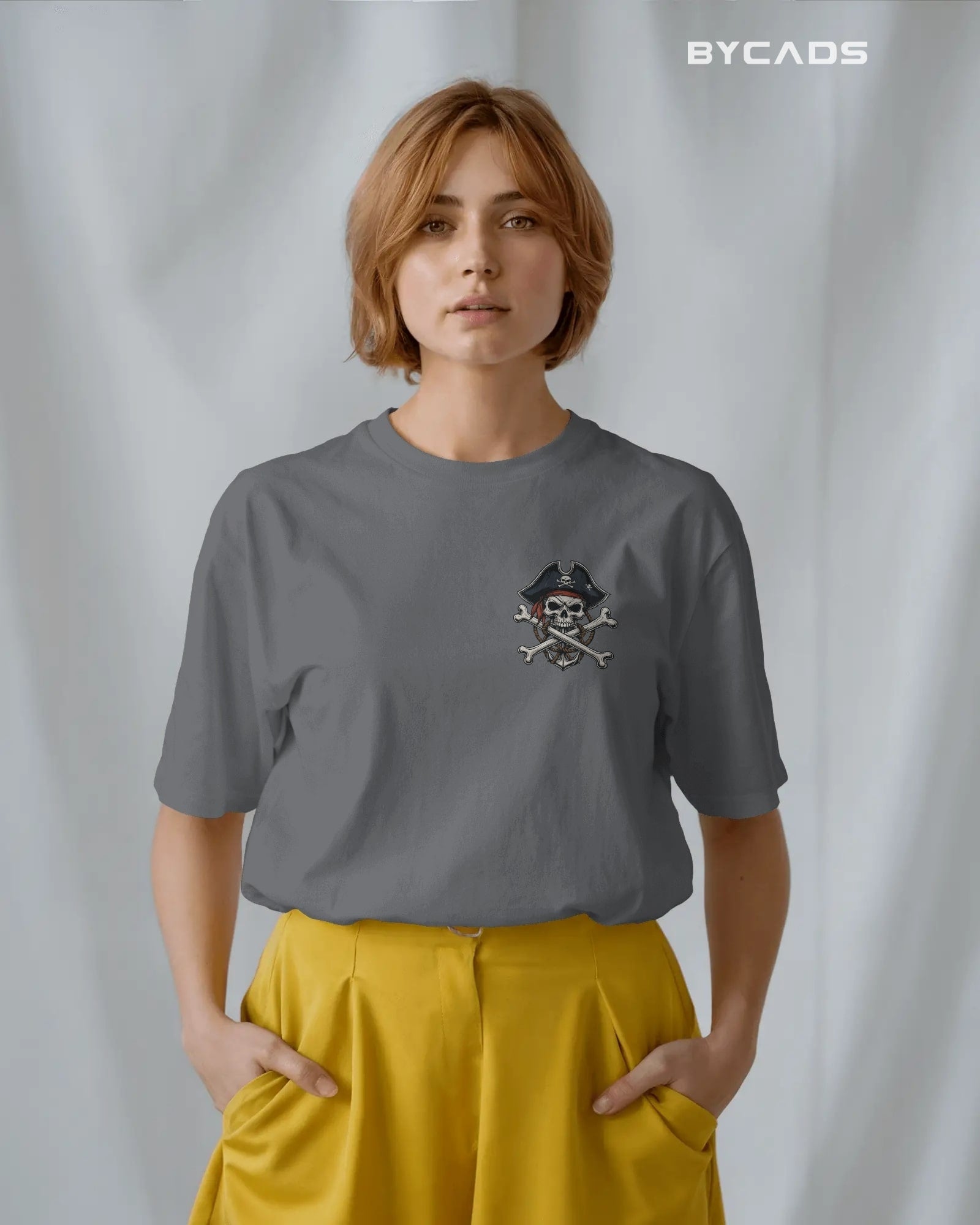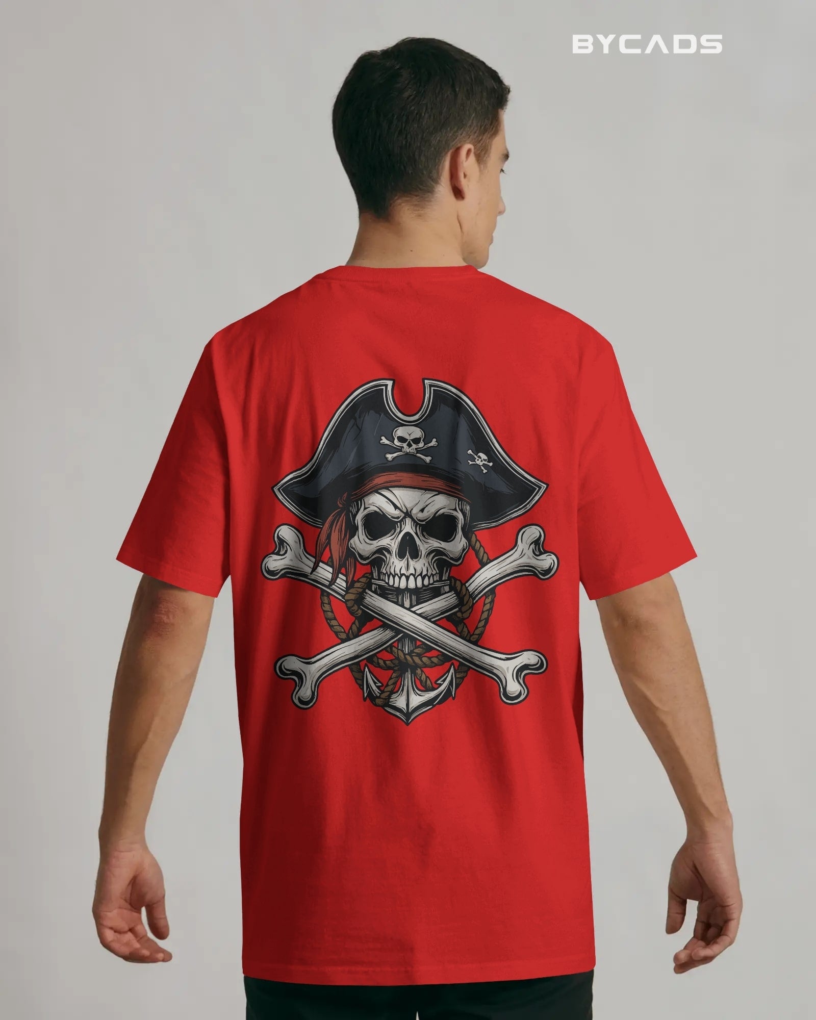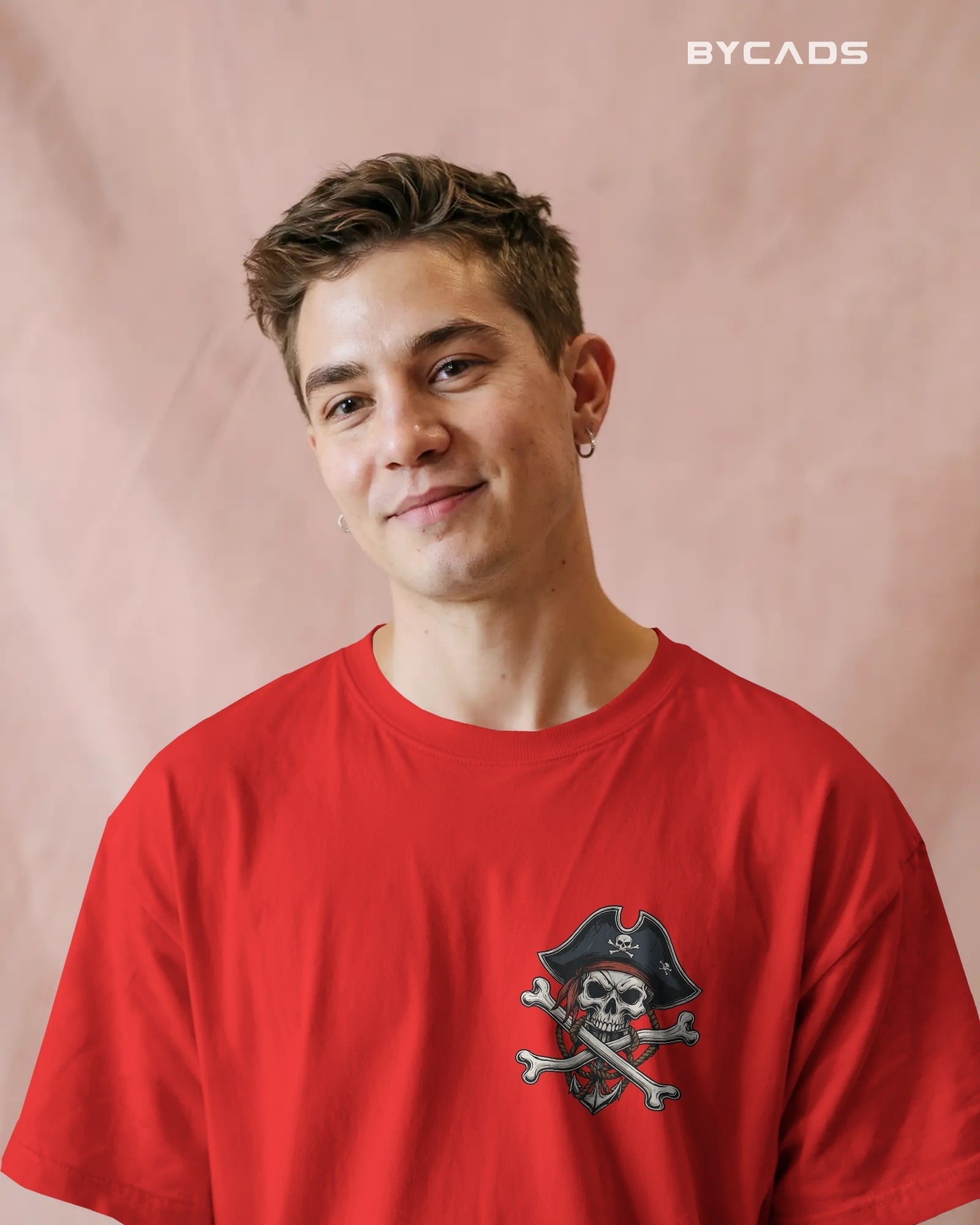 Rule the streets with this fierce Crossbones Pirate Tee by Bycads. Featuring a menacing skull in a pirate hat, framed by crossed bones and nautical rope, this oversized fit is made for those who sail against the current and fight with grit. A symbol of boldness, rebellion, and ruthless confidence.