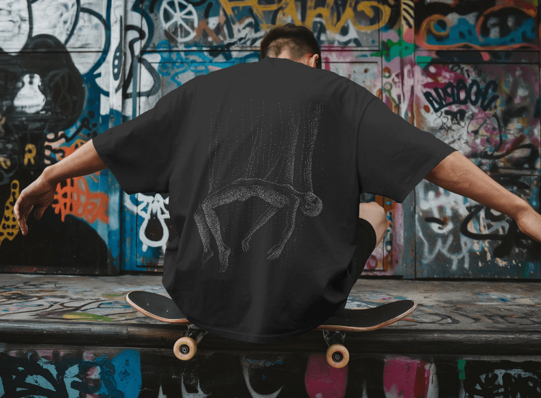 Step into the world of abstract street fashion with Bycads’ Floating Human Oversized T-Shirt. This unique design showcases an ethereal, dotted sketch of a human figure seemingly suspended by invisible threads — a statement piece for art lovers and streetwear enthusiasts alike. The oversized black tee pairs perfectly with skater jeans, cargo pants, or shorts, giving you that effortlessly cool, urban edge.