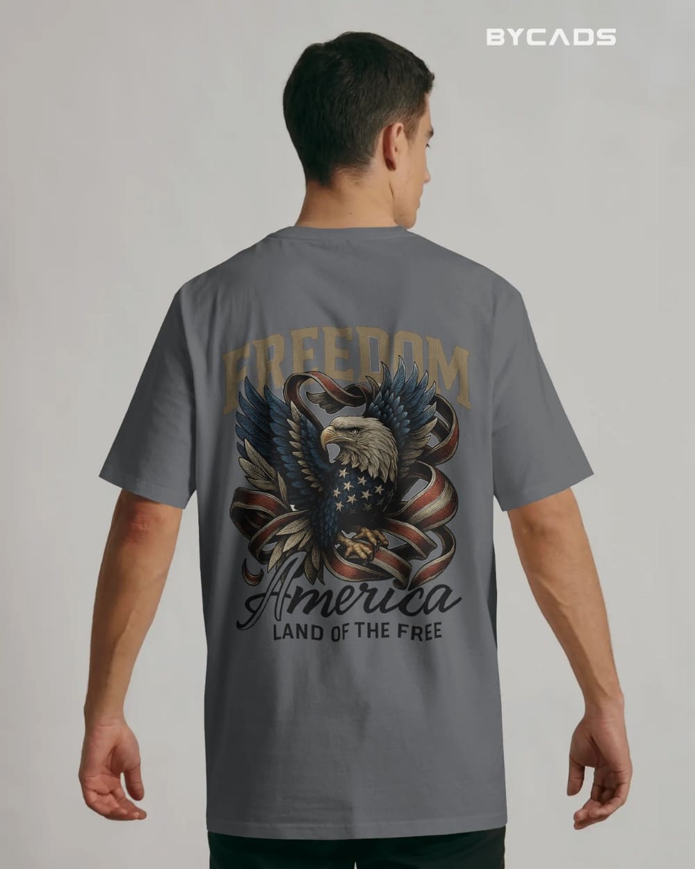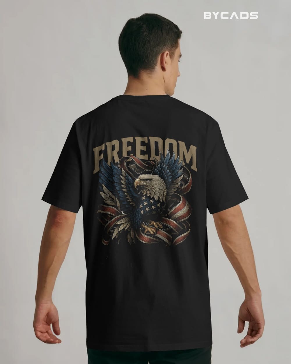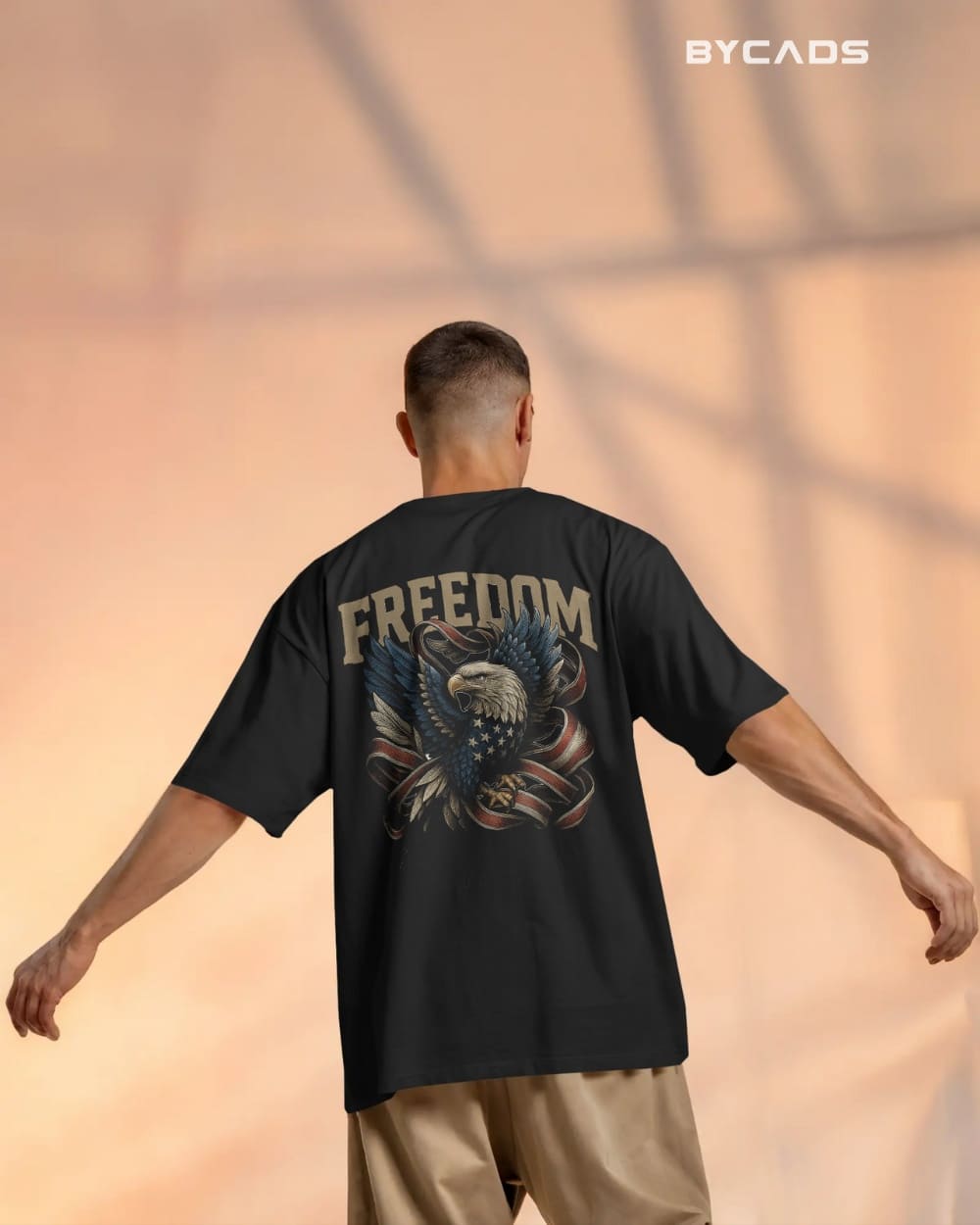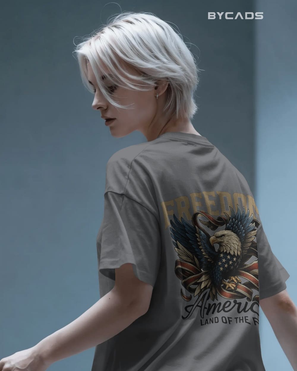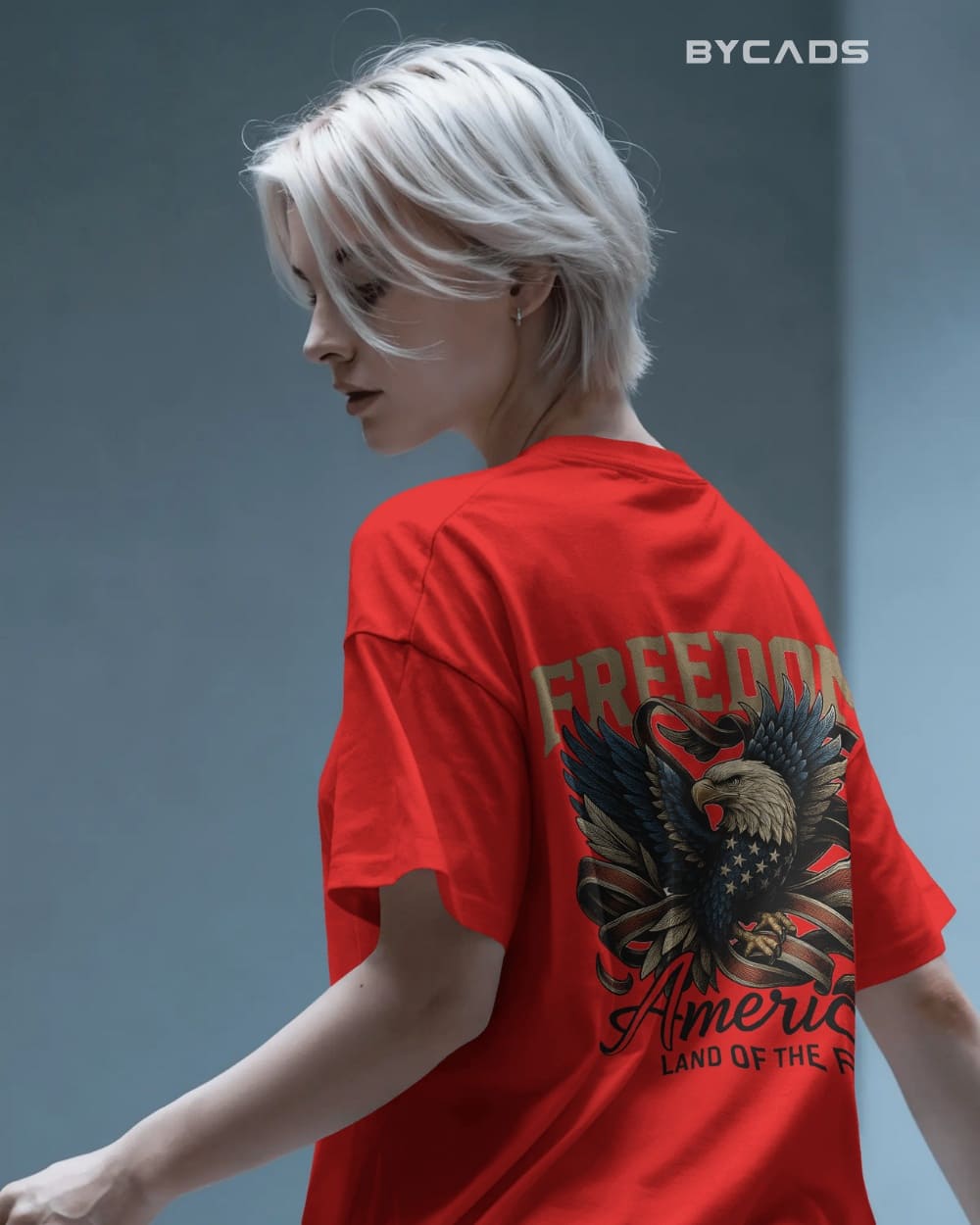 Embrace bold patriotism and fearless spirit with the Freedom Eagle Oversized T-Shirt by Bycads. Featuring a detailed bald eagle wrapped in an American flag motif beneath the powerful word FREEDOM, this tee is a tribute to strength, pride, and unshakable individuality.