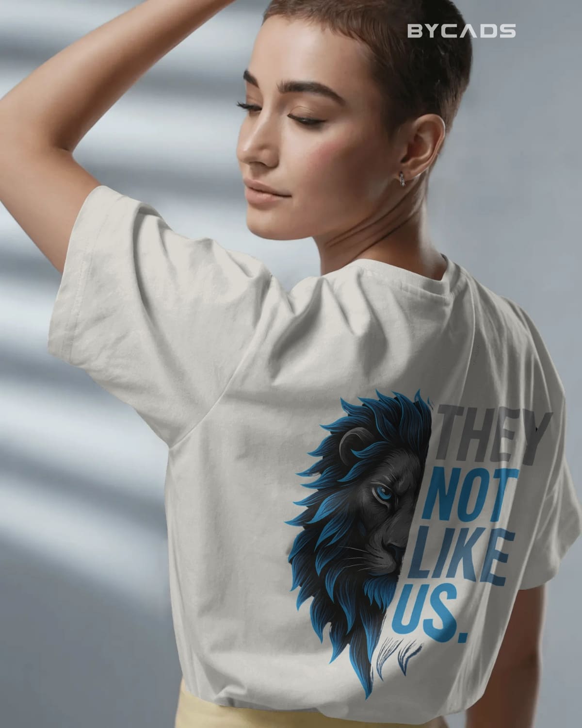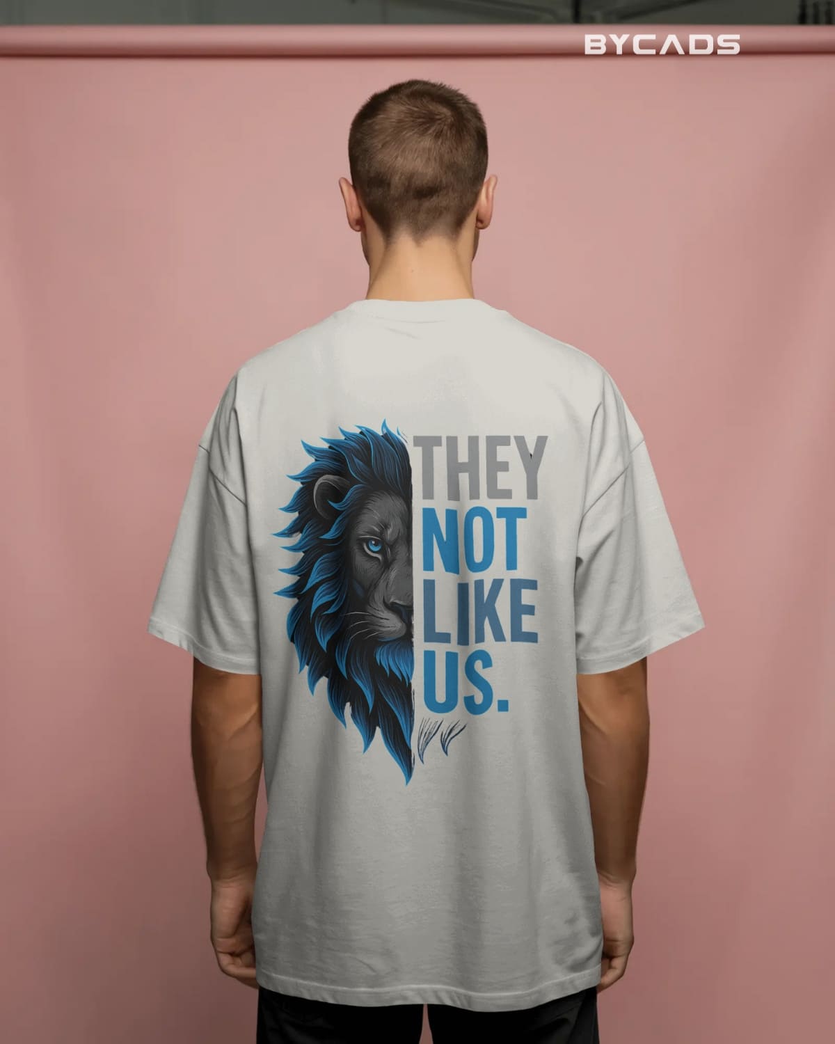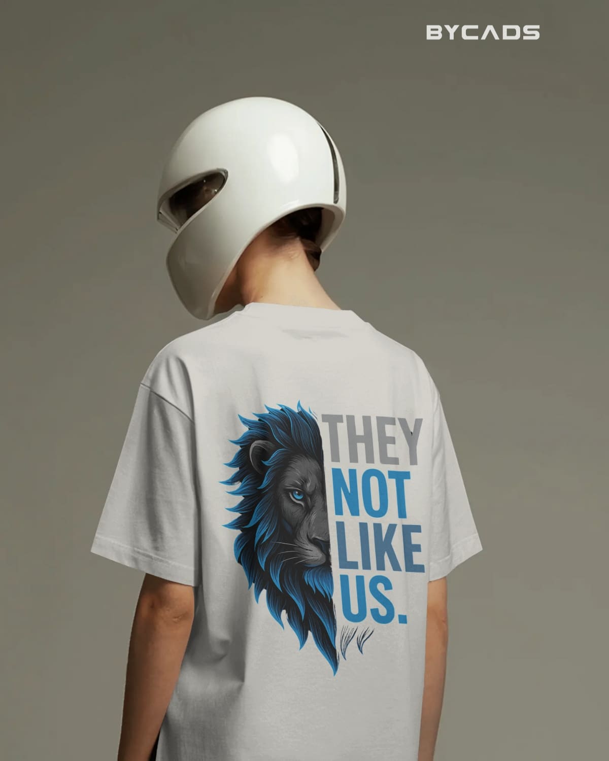 Unleash your inner strength with the Lone King Lion Statement T-Shirt by Bycads. This powerful oversized t-shirt features a fierce half-lion graphic paired with the bold statement "THEY NOT LIKE US," making it the perfect expression of confidence, individuality, and dominance.