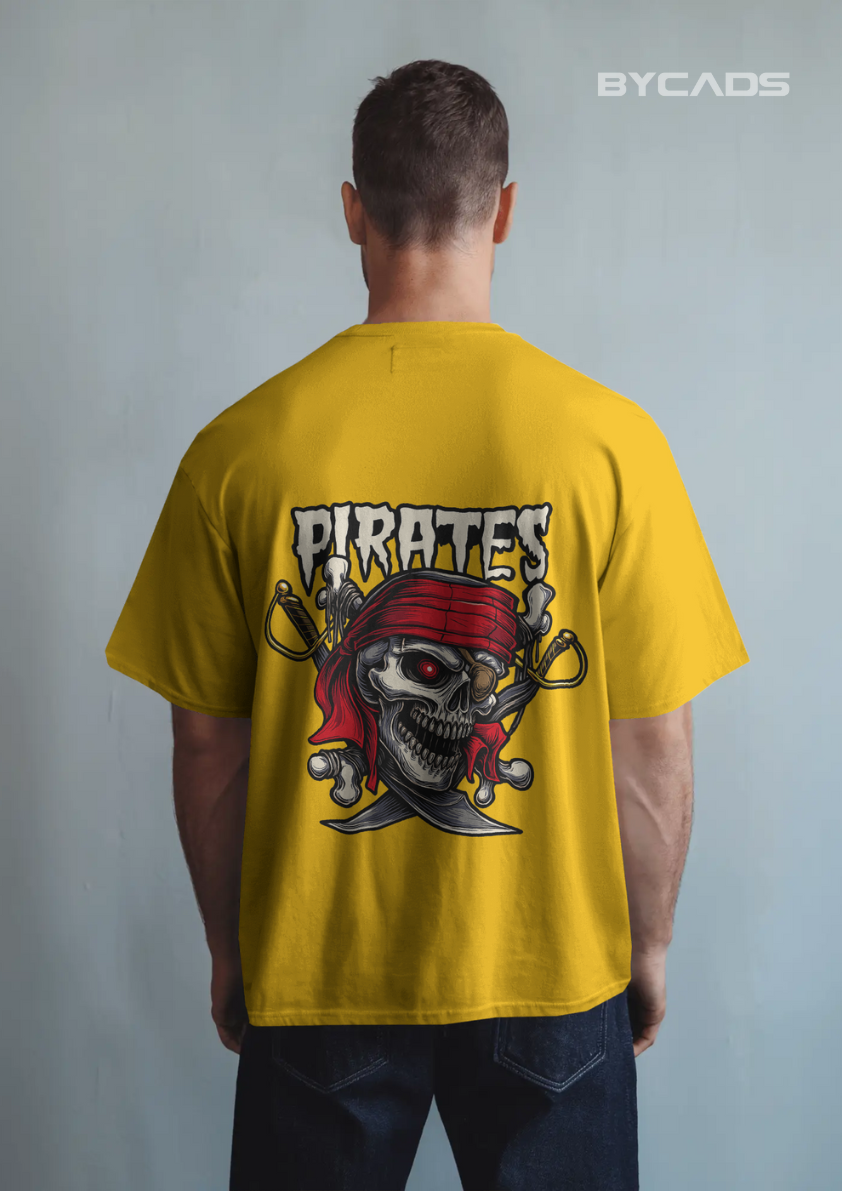 With Bycads' Pirate Skull Oversized T-Shirt, you may sail into rebellious fashion. Under the rebellious "PIRATES" inscription, this striking image features a terrifying skull wearing a red bandana, surrounded by twin crossed cutlasses and smoking cannons. This design is ideal for rule-breakers, adventurers, and people who flourish outside the bounds of the map because of its dark flair and nautical edge.