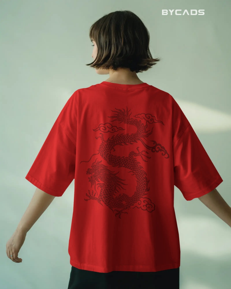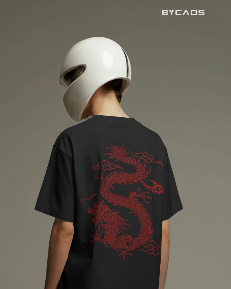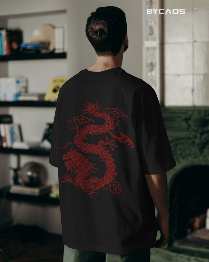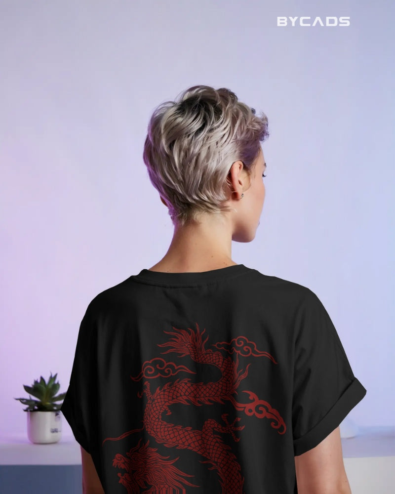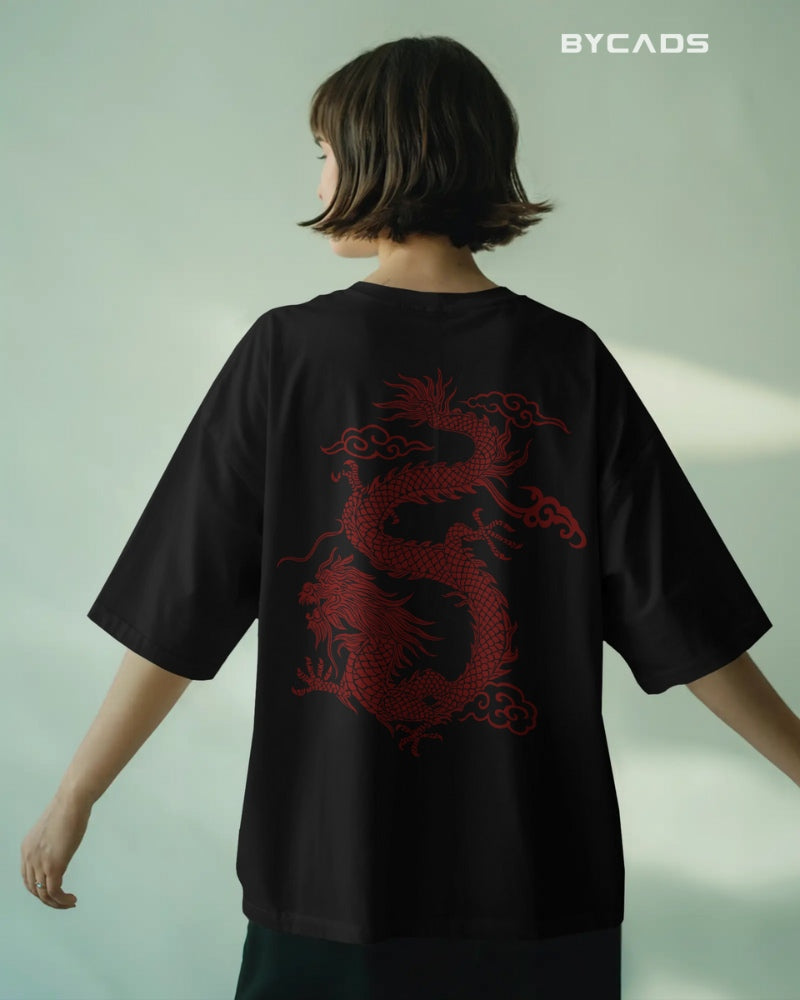 Inspired by Eastern mythology and streetwear aesthetics, this oversized black t-shirt features a fierce red dragon curling across the back. Representing strength, luck, and mastery, the detailed artwork makes a bold statement without saying a word. The premium fabric offers a smooth, breathable feel, while the relaxed fit lets you conquer your day in style. A must-have for fashion warriors and cultural trendsetters alike.
