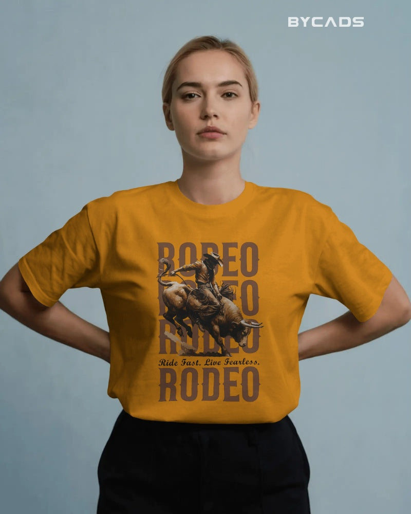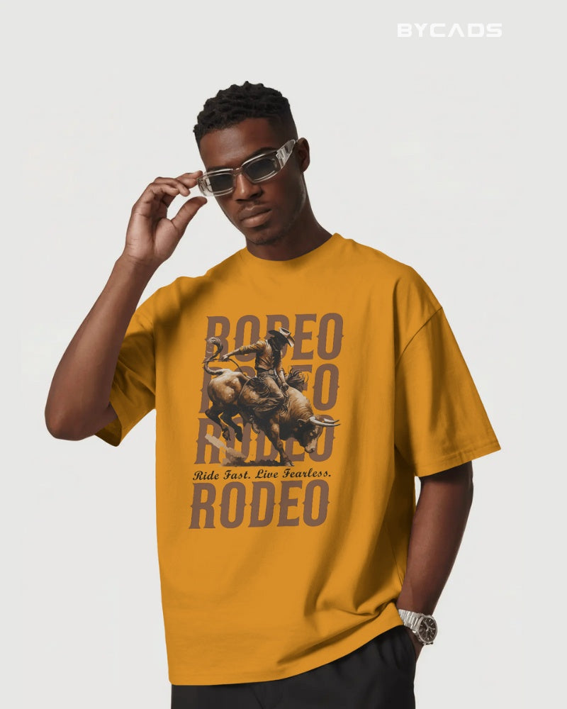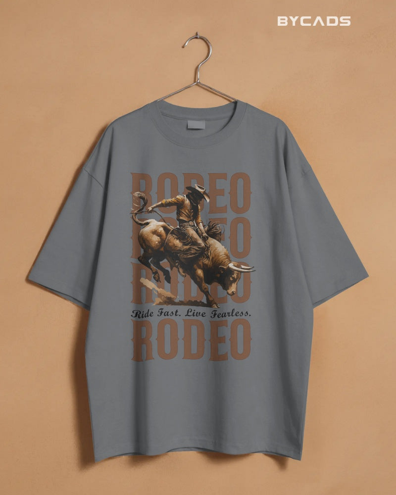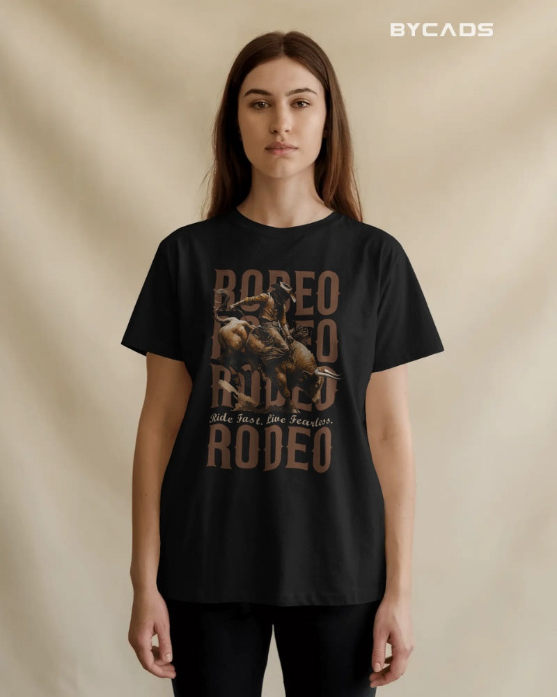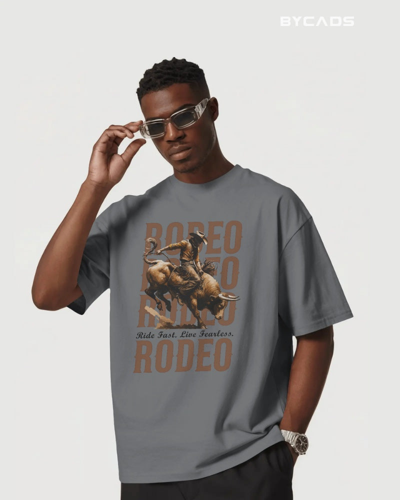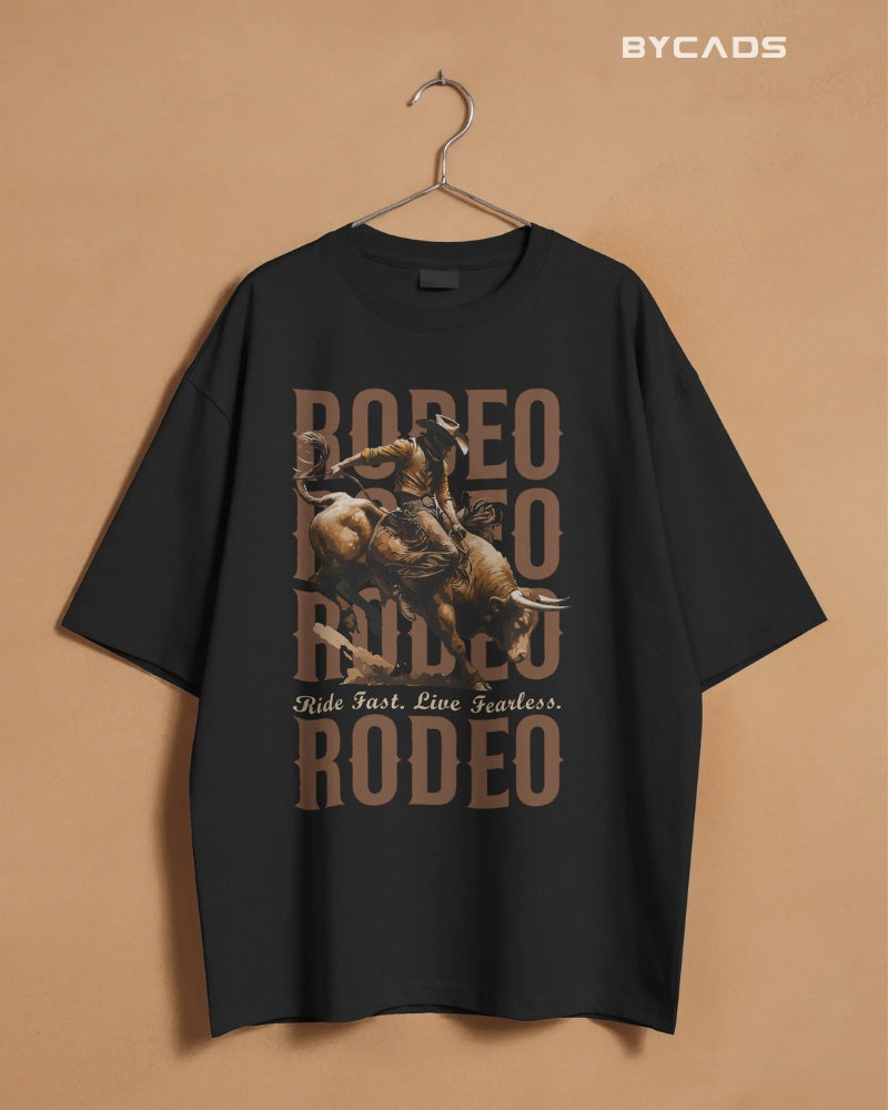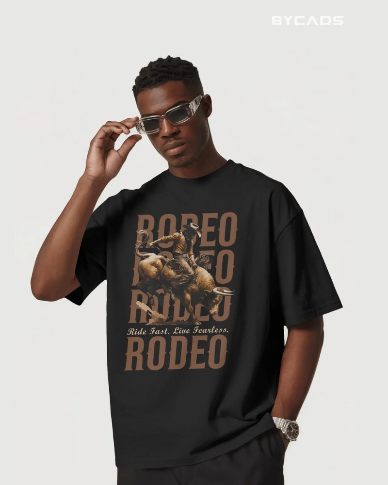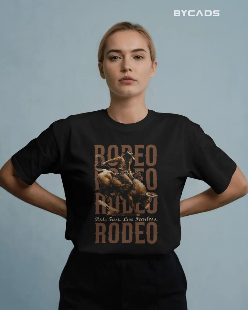 The “RODEO RUSH” tee captures the wild spirit of the arena with a powerful illustration of a bull rider mid-action — hat down, grip strong, heart racing. Repeated bold text RODEO stamps the backdrop with raw impact, while the bottom line dares you: