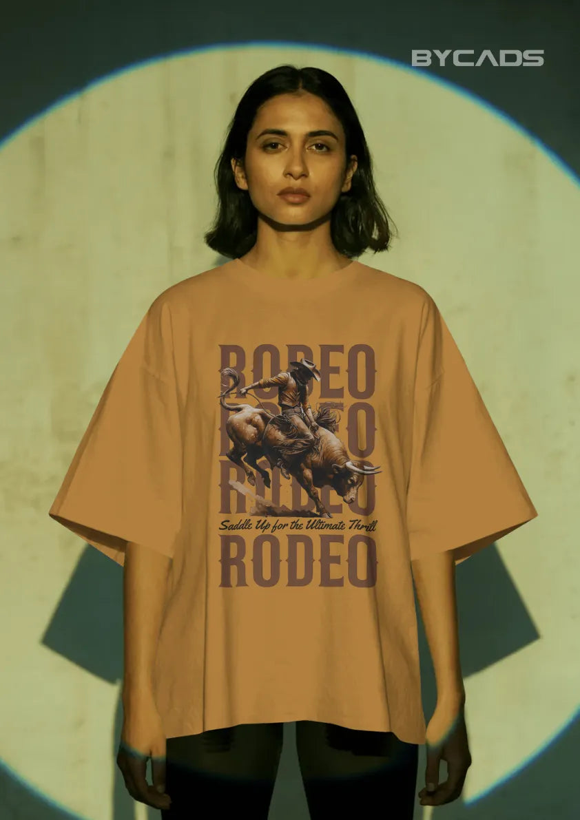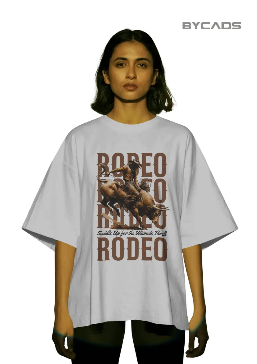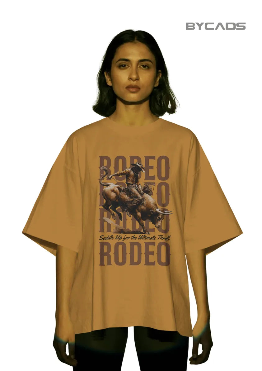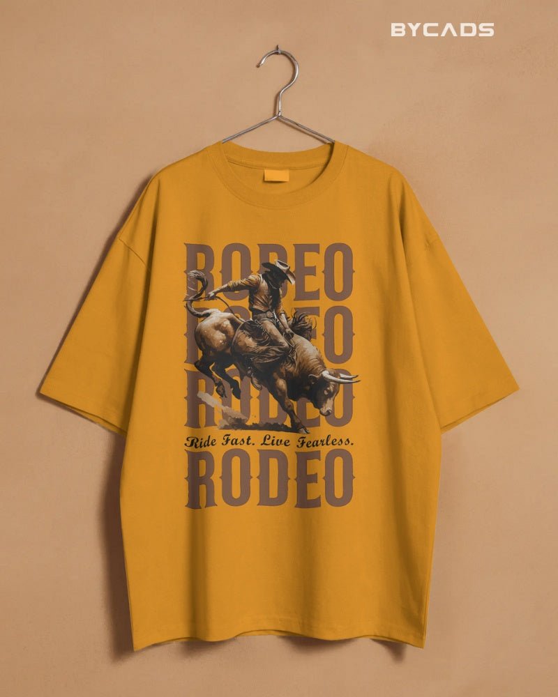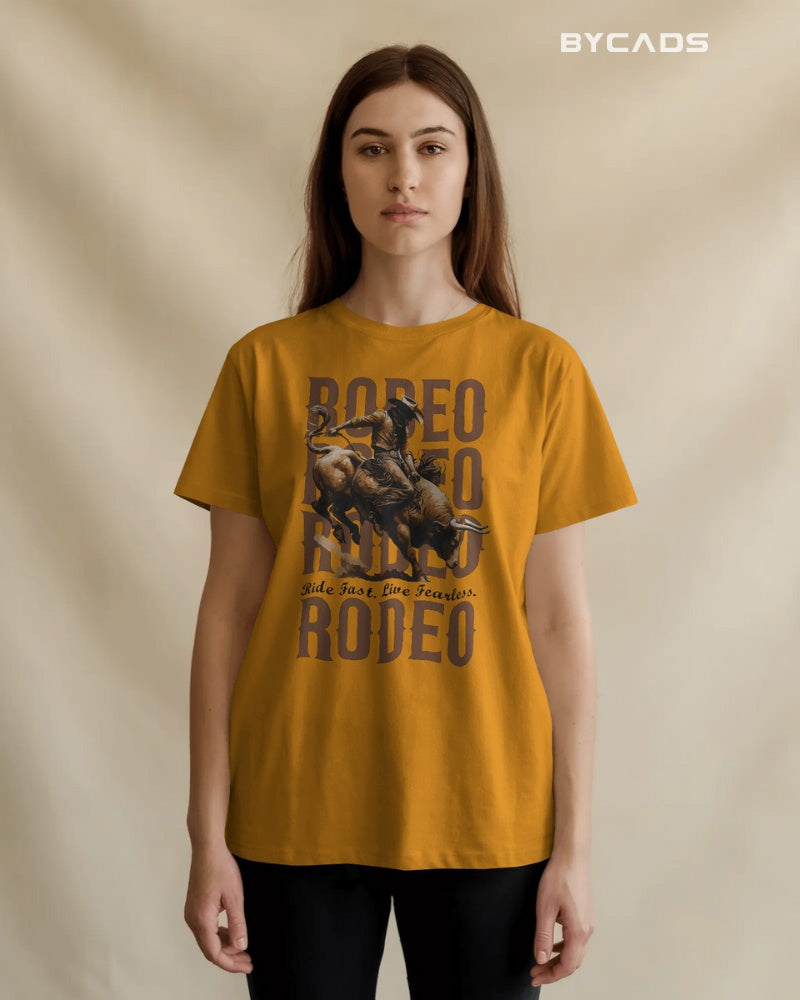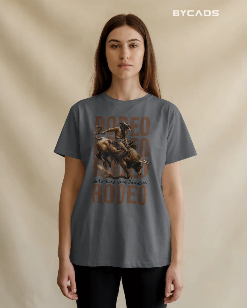 The “RODEO RUSH” tee captures the wild spirit of the arena with a powerful illustration of a bull rider mid-action — hat down, grip strong, heart racing. Repeated bold text RODEO stamps the backdrop with raw impact, while the bottom line dares you: