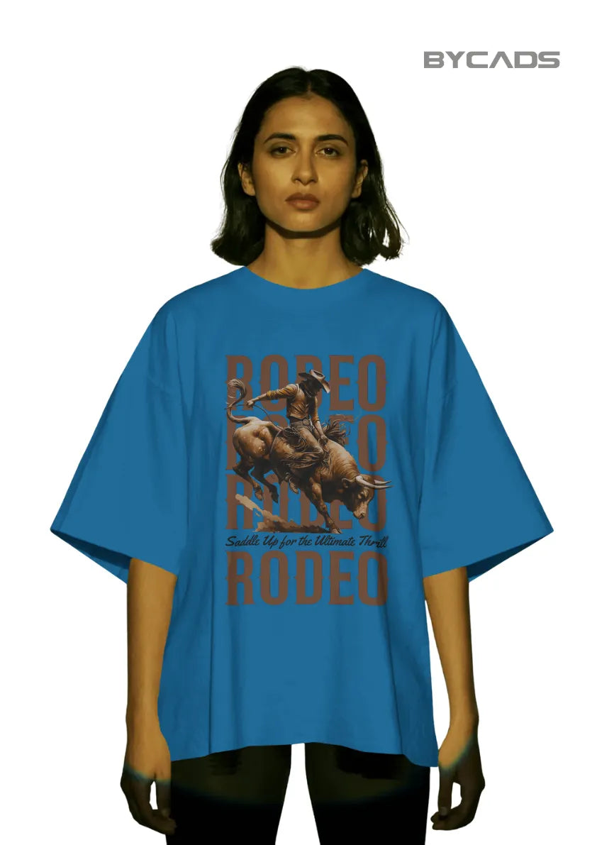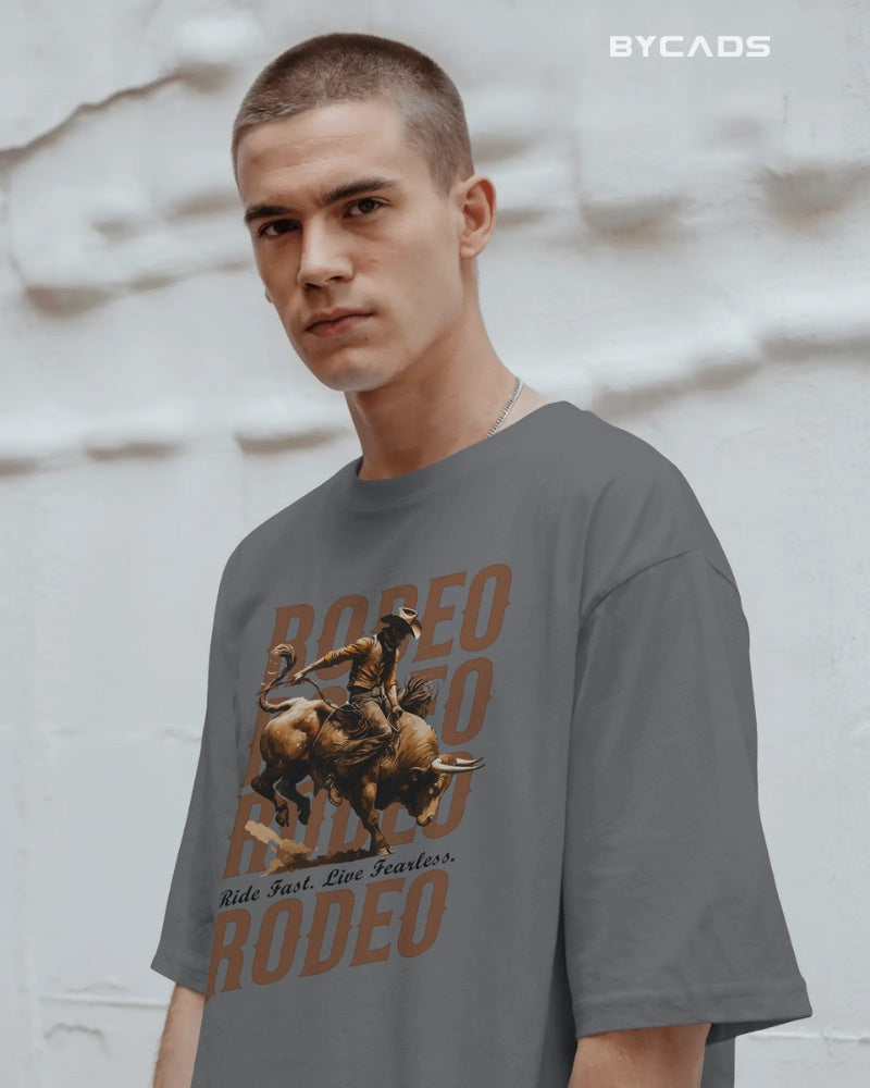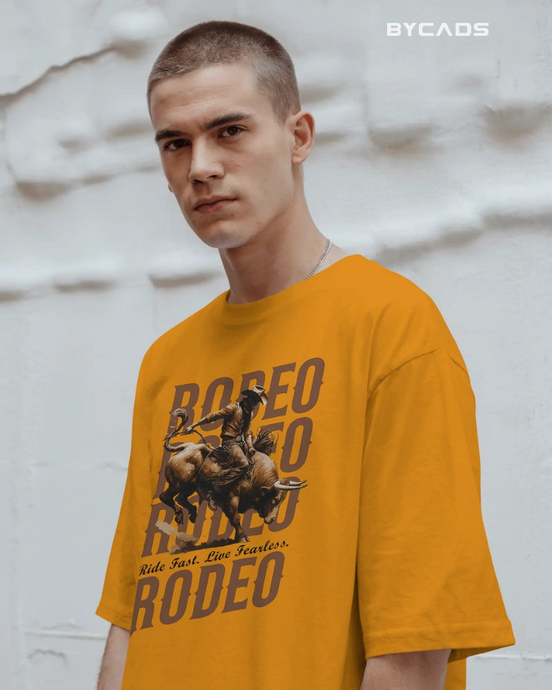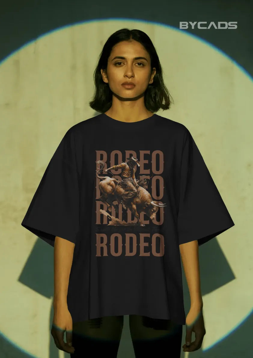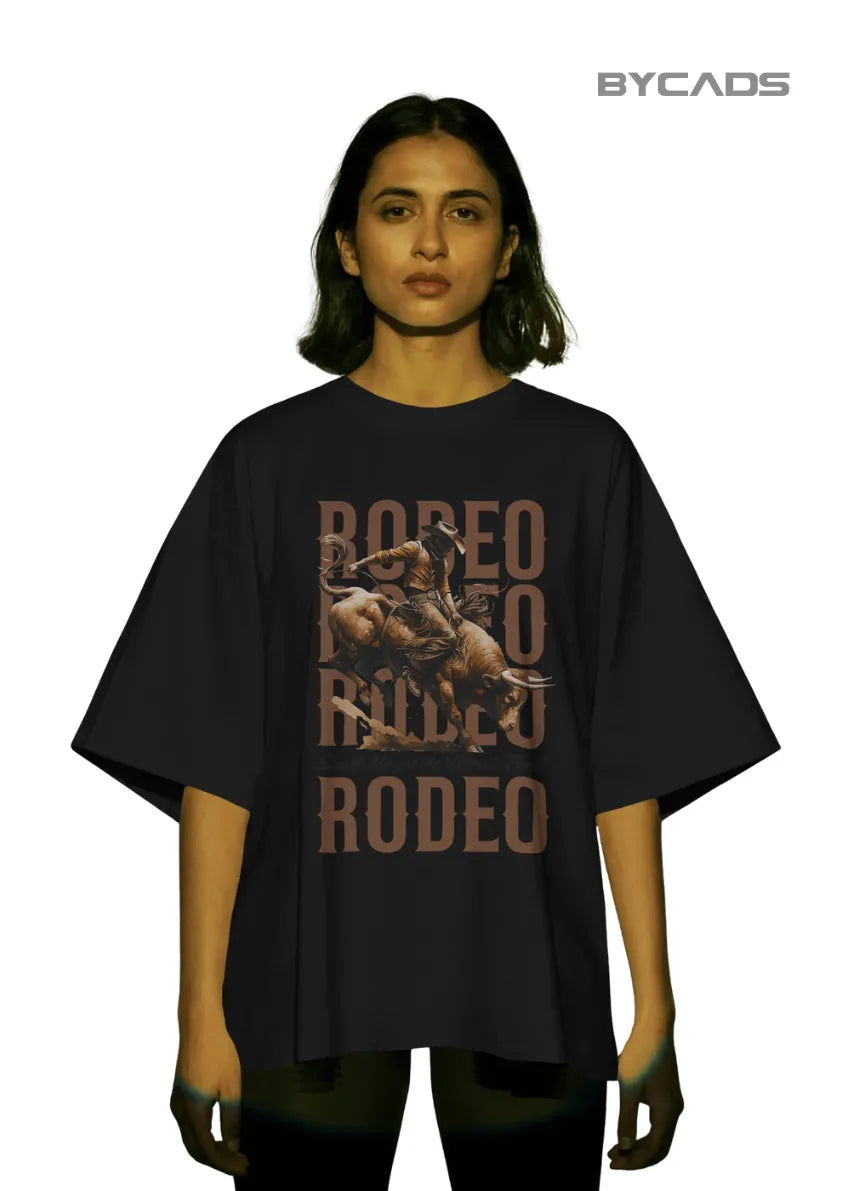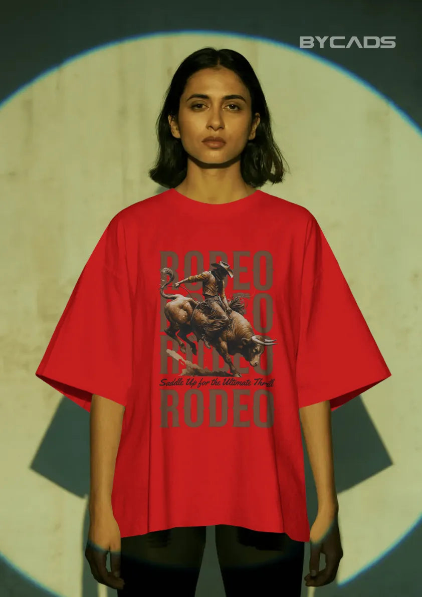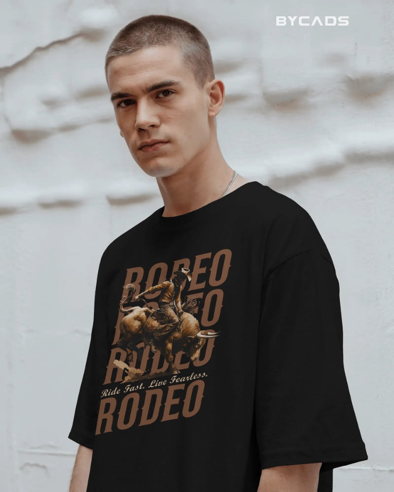 The “RODEO RUSH” tee captures the wild spirit of the arena with a powerful illustration of a bull rider mid-action — hat down, grip strong, heart racing. Repeated bold text RODEO stamps the backdrop with raw impact, while the bottom line dares you: